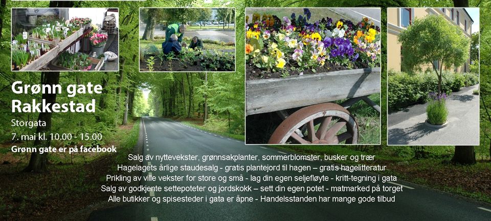 Hei til alle plante- og hageelskere! Nå er koronatiden endelig over og vi er i full gang med å planlegge årets Grønn gate. Lørdag 7. mai stenger vi Storgata og boltrer oss med mange spennende aktiviteter for både voksne og barn. Mange utstillere med planteliv i fokus vil være på plass. Dessuten frister butikker og spisesteder med gode tilbud. Mer detaljert program kommer når dagen nærmer seg.